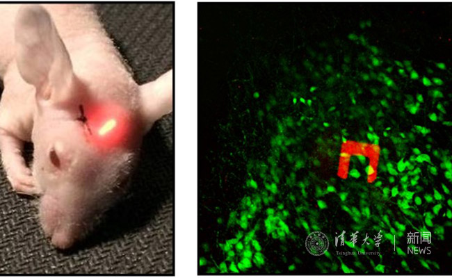 这种可无线控制和远程激发的上转换微型光源不仅解决了传统的植入式光纤、电缆等的有线光电能量传输方式的束缚,而且打破了电感耦合及电磁辐射等无线供能方式中大尺寸器件和传输距离的限制。通过与生物医学研究人员合作,将波长上转换光源探针植入活体动物皮下,利用近红光处于生物组织透明窗口波段范围和可穿透深层组织的特点,成功的激发和调制器件发射可见光。结合光遗传技术,将微型上转换光源植入动物脑内,利用近红外光成功实现了对神经系统的光学调控。该研究为低创伤、无线、植入式光电神经接口的实现提供了新的研究思路。