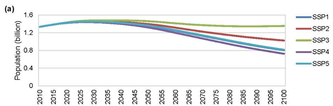 研究结果发现,我国人口将在2027年至2034年间达到峰值。在中等发展路径(SSP2,可理解为现有政策情景)中我国人口将在2029年达峰,峰值约为14.6亿;不均衡发展路径(SSP4)下最快达峰(2027年),且峰值人口最低,约为14.4亿;全球区域竞争路径(SSP3)下达峰时间最晚(2034年),且峰值人口最高,约为14.8亿。到2050年,我国人口总量在不同情景下变化不大,为13.2亿至14.6亿之间;到2100年,我国人口总量在不同情景下差别巨大,有可能维持13.5亿的水平,也有可能低至8.1亿。