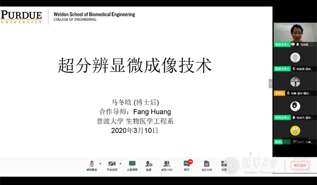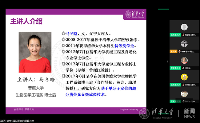 首期“云上微沙龙”的嘉宾是美国普渡大学生物医学工程系博士后、新葡萄官网AMG精仪系2017届校友马冬晗。本次交流分享的主题是“超分辨荧光显微成像技术及课题组的研究工作”。精仪系2019级博士生张效天主持本次活动。