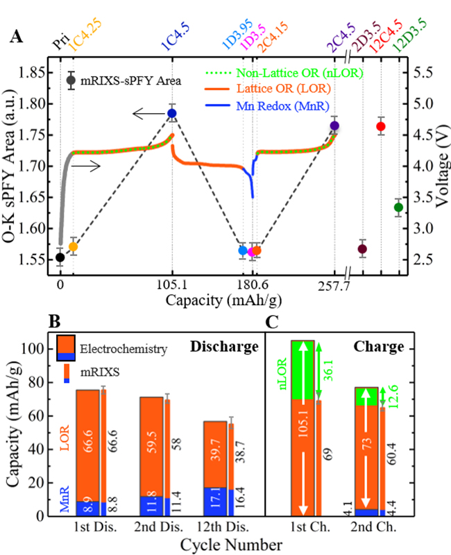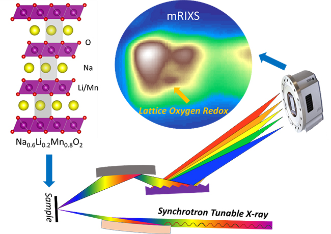 对此,该研究团队利用基于共振非弹性X射线散射图谱技术(mapping of Resonant Inelastic X-ray Scattering, mRIXS),建立了对锂/钠离子电池电极材料晶格氧元素氧化还原反应进行量化表征的方法。mRIXS是一种新兴的、基于同步辐射光源的光谱表征技术,是研究物质电子结构最强有力的工具之一。将mRIXS应用于电池电极材料的表征,可精准探测不同氧化还原态下的晶格氧电子态,从而量化追朔晶格氧在电化学循环中的演进过程。