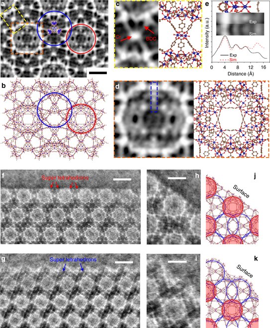 针对这一问题,新葡萄官网AMG化工系魏飞教授课题组借助积分差分相位衬度技术(iDPC-STEM),解决低电子束流下图像分辨率和信噪比低的问题,并通过控制电子剂量,以非常高的分辨率和信噪比对MIL-101,一种稳定的MOF材料,实现了原子级成像,分辨率可达1.8埃(图1所示),是目前文献报道中此材料的最高分辨率。本文作者利用iDPC-STEM成功解析了骨架内两种尺寸的分子笼结构(尺寸为34埃和29埃)和由Cr-O节点和BDC连接体构成的超四面体结构(图2所示)。基于这些原子级观察,揭示了MIL-101晶体两种不同的{111}表面结构及其稳定性(图2所示)。同时还观察了自组装晶体的表面、界面和缺陷的结构及演化。通过这些局部结构的表征,可以更好地了解MOF中节点和连接体的配位方式,进一步研究MOF的结构-性能关系。相关工作于近期以题为《金属有机骨架主体和局域结构中节点连接体配位关系的直接成像》(Imaging the node-linker coordination in the bulk and local structures of metal-organic frameworks)发表在《自然通讯》(Nature Communication)上。