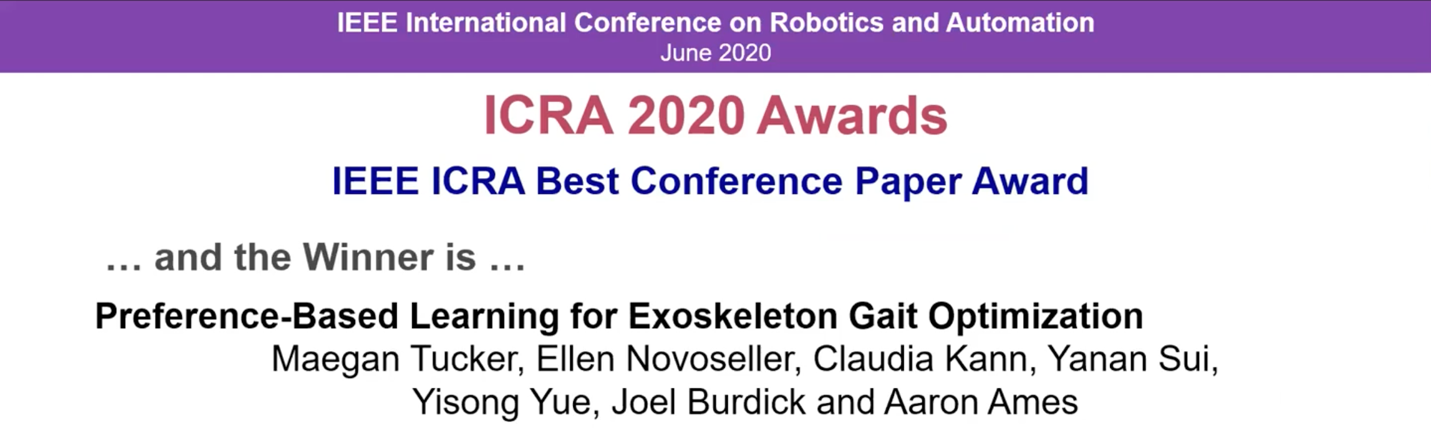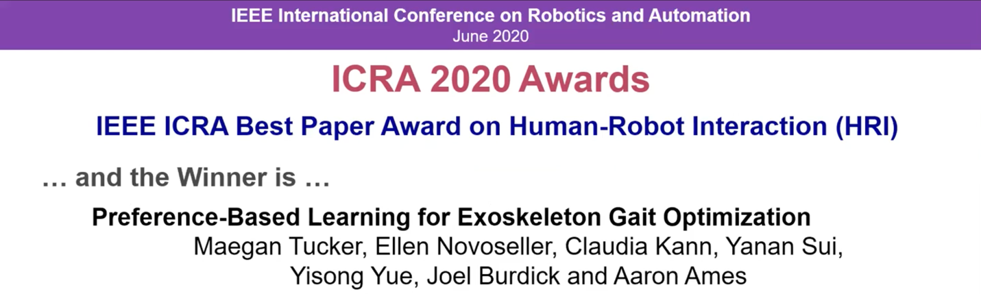 新葡萄新闻网6月16日电 在近日举行的2020年机器人与自动化国际会议(International Conference on Robotics and Automation,简称ICRA)上,新葡萄官网AMG航天航空学院助理教授眭亚楠与美国加州理工学院的合作者发表了题为“基于偏好反馈的外骨骼步态优化学习”(Preference-Based Learning for Exoskeleton Gait Optimization)的研究论文,获得大会唯一最佳论文奖,并同时获得最佳人机交互论文奖。