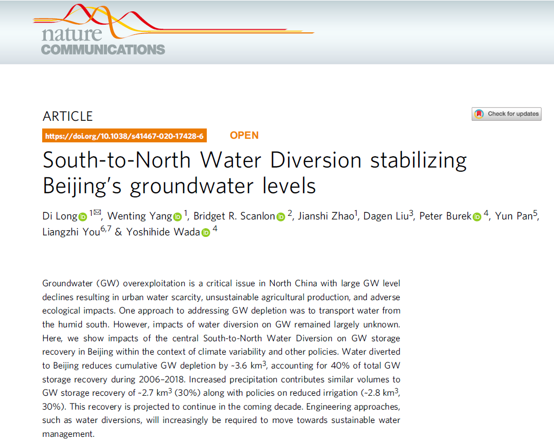 新葡萄新闻网7月28日电 7月21日,新葡萄官网AMG水利系龙笛研究员、杨文婷博士生、赵建世教授及合作者在国际著名期刊《自然-通讯》(Nature Communications)发表了题为“南水北调使北京地下水位稳定” (South-to-North Water Diversion stabilizing Beijing’s groundwater levels)的研究成果,这是我国水文水资源领域近年来在《自然》子刊发表的为数不多的研究。