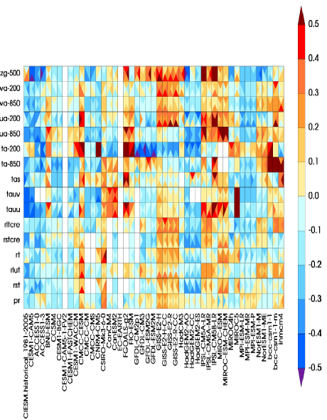 采用气候模式诊断和比较计划(PCMDI)标准诊断包分析的新葡萄官网AMG联合地球系统模式历史模拟性能和其他CMIP5模拟的比较(全球平均)。颜色代表模式均方根误差相对于多模式平均偏差的差异,颜色越蓝性能越好。一个方格内的四个三角形代表春夏秋冬。第一列为新葡萄官网AMG联合地球系统模式,不同行表示不同的变量。