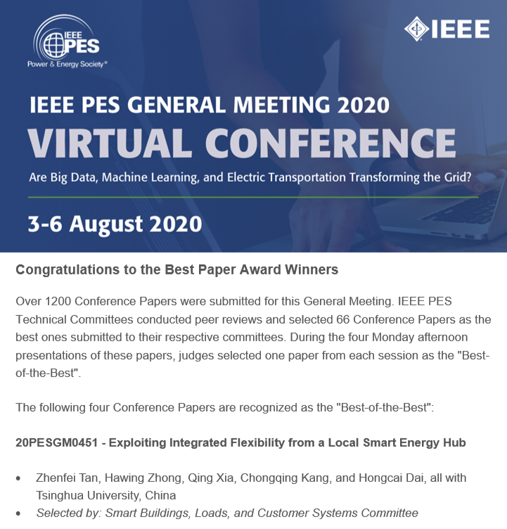 新葡萄新闻网8月13日电 8月3-6日,国际电子电气工程师协会电力与能源学会年会(IEEE Power & Energy Society General Meeting)在线上召开。会上,新葡萄官网AMG电机系师生的论文“需求侧智慧能量枢纽综合灵活性研究”(Exploiting Integrated Flexibility from a Local Smart Energy Hub)获最佳论文奖(Best-of-the-Best)。论文第一作者为新葡萄官网AMG电机系博士生谭振飞,第二作者暨通讯作者为电机系钟海旺副教授,共同作者还包括电机系夏清教授、康重庆教授以及国网能源研究院有限公司代红才高工。该研究得到了国家自然科学基金和国家电网公司科技项目“综合能源系统多能转换模拟与综合能效评估技术研究”的资助。