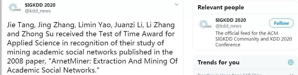 新葡萄新闻网8月24日电 8月13日,2020年知识发现和数据挖掘国际会议(SIGKDD 2020)官方公布了2020年国际数据挖掘与知识发现大会(ACM SIGKDD,简称KDD)创新奖、服务奖、论文奖、新星奖、时间检验研究奖、时间检验应用科学奖六大奖项的获得者,这些奖项是针对数据科学、机器学习、大数据和计算机科学领域的杰出个人和研究团队而设立。