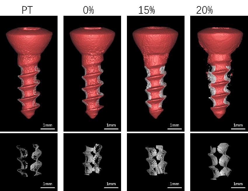 图2 micro-CT 3D重建图像显示钛金属植入物周围骨生成情况
