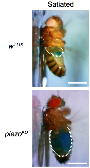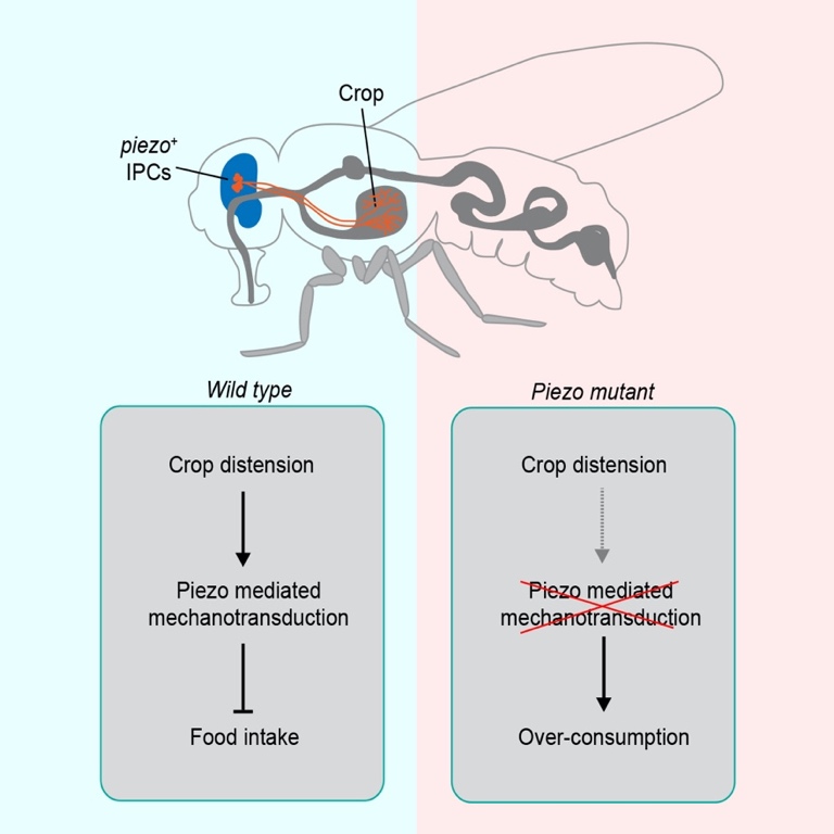 日前,新葡萄官网AMG生命学院、新葡萄IDG/麦戈文脑科学研究院张伟研究员课题组报道了关于机械感受产生饱腹感的神经机制的最新研究结果。该研究发现,机械敏感离子通道基因piezo的突变(piezoKO)会显著影响果蝇的进食行为。与野生型相比,piezoKO果蝇会过量进食或者饮水,部分果蝇甚至会一直进食至嗉囊(功能与哺乳动物的胃相似)被胀破。作者进一步鉴定出大脑中一群表达piezo的神经元,它们在果蝇嗉囊壁上形成丰富的树突结构,可以被嗉囊的胀大引起的张力激活,从而在进食过程中实时检测嗉囊的体积变化;失活这些神经元会导致过度进食,而激活它们可以抑制进食。作者还发现,小鼠的Piezo1蛋白可以挽救果蝇piezo基因缺失导致的过量进食表现,提示机械力调节进食这一功能在进化上可能是保守的。