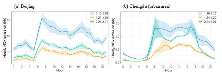图2 北京全市和成都市区不同时段机动车NOx排放动态变化规律
