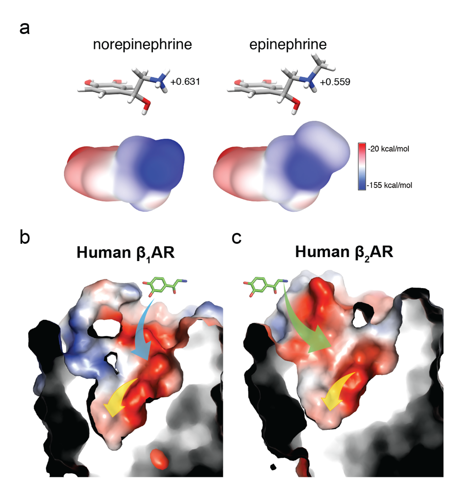 G蛋白偶联受体是最大的膜受体蛋白家族,在人类基因组中有800多个成员, 调控着重要的生理功能。β肾上腺素受体属于G蛋白偶联受体家族,受交感神经系统调控,被去甲肾上腺素和肾上腺素激活,参与调节如心跳、呼吸等关键的生理过程,也是研究G蛋白偶联受体的经典模型。β肾上腺素受体包含β1肾上腺素受体、β2肾上腺素受体、β3肾上腺素受体三个亚型。激素(hormone)肾上腺素对 β1和 β2肾上腺素受体具有相近的亲和力,而神经递质(neurotransmitter)去甲肾上腺素对于β1肾上腺素受体亲和力比β2肾上腺素受体高了10倍左右。两个内源配体对受体的不同选择性对于调控心脏的生理活动具有重要意义。去甲肾上腺素和肾上腺素的分子式十分相似,只有一个甲基的不同。而β1和β2肾上腺素受体结合天然配体的所有氨基酸都是一模一样的。去甲肾上腺素为什么会在两个完全保守的配体结合口袋具有10倍的亲和力差异,是一个困扰了研究界40多年的问题。