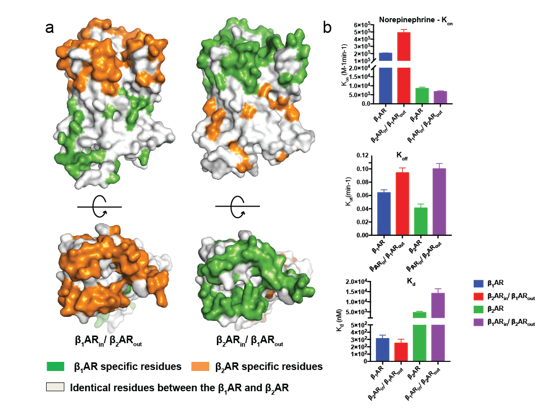 a.嵌合受体的设计 b.去甲肾上腺素结合野生型β1、β2肾上腺素受体及嵌合受体的动力学研究