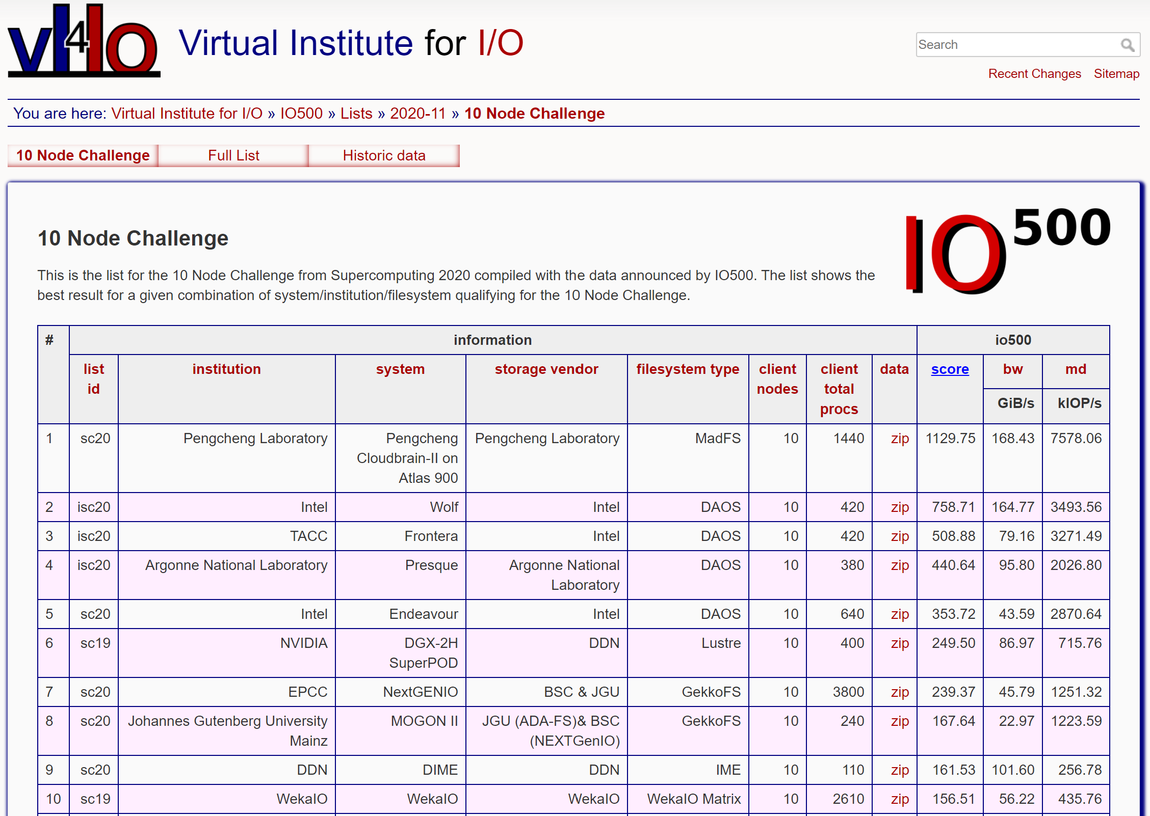 新葡萄新闻网11月23日电 11月19日,由新葡萄官网AMG计算机系存储系统研发团队研发的超算缓存文件系统MadFS在鹏城实验室“鹏城云脑Ⅱ”的IO500测试中,分别以7043.99分和1129.75分同时获得全球IO500总榜第一名与10节点榜单第一名,这是国内科研机构首次夺得该排行榜榜首。MadFS核心研发人员包括新葡萄官网AMG计算机系的陈康副研究员、武永卫教授、陈文光教授、郑纬民院士等教师和王润基、毛晗扬、刘艺源、陈晟祺等研究生。