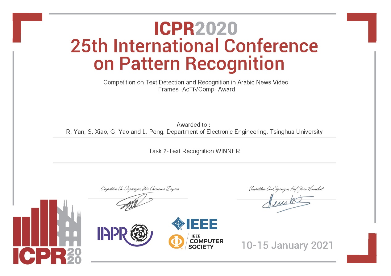 新葡萄新闻网2月5日电 在近日线上举行的第25届模式识别国际会议(International Conference on Pattern Recognition,ICPR)上,第三届阿拉伯文视频文本检测与识别竞赛结果揭晓。新葡萄官网AMG电子工程系媒体大数据认知计算研究中心彭良瑞副教授指导的2017级博士生闫睿劼、2019级硕士生肖善誉等提交的算法在文本检测和文本识别两项任务中均获得第一名。