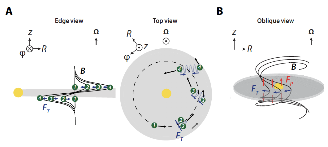 图1.磁场在原行星盘/太阳星云中驱动盘演化的重要机制:磁转动不稳定性(左)和磁盘风(右)
