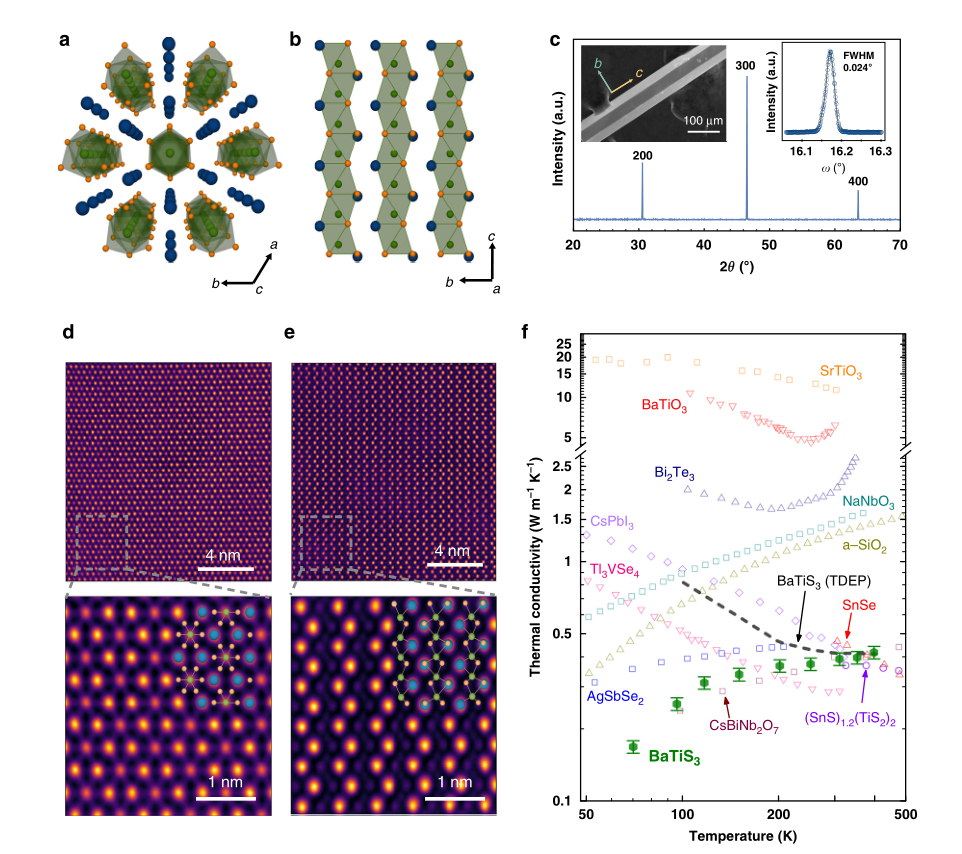 图1. BaTiS3单晶结构及其热导率随温度变化关系