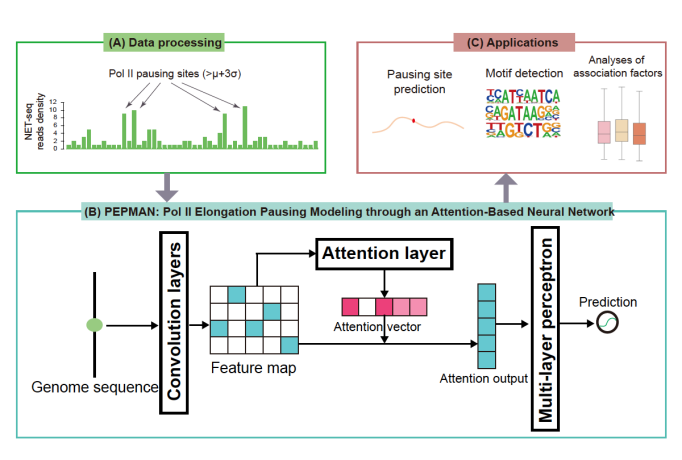 真核生物的转录是一个高度复杂且被准确调控的动态过程,RNA聚合酶II(RNA polymerase II, Pol II)作为转录过程(特别是转录延伸阶段)的核心分子成员,对遗传信息的传递起着关键作用。研究表明,在转录延伸过程中,普遍存在Pol II暂停(Pol II pausing)现象,其参与下游基因的表达调控、影响基因可变剪切的发生,与细胞分化、发育等生命活动息息相关。目前,Pol II暂停相关的转录调控机制研究主要依赖于NET-seq(Native elongating transcript sequencing)等高通量测序技术,成本高、需要一定实验周期。因此,如何实现在全基因组水平上快速、高效的分析Pol II暂停的偏好位点及其序列特征,以及其与相关转录因子间的关系,是转录调控领域亟待解决的技术难点。为了解决这一问题,来自新葡萄官网AMG的曾坚阳、赵诞团队采用基于注意力机制(attention mechanism)的卷积神经网络对全基因组上的Pol II暂停位点进行预测。在NET-seq数据集上,其预测准确率均显著优于现有机器学习模型。此外,研究组通过分析模型的注意力机制以及分析模型在基因组上特定位点的预测值,进一步探索了Pol II暂停的生物学特征以及和其他转录调控机制的关系,包括:发现了决定Pol II暂停的序列特征以及其与暂停位点的关系;通过分析不同可变剪切方式位点上Pol II的暂停倾向,提供了Pol II影响可变剪切的可能生物学机制;全面分析了Pol II与转录因子、组蛋白修饰、DNA甲基化发生的相关性;发现模型能够很好的弥补测序数据深度不足带来的缺陷。