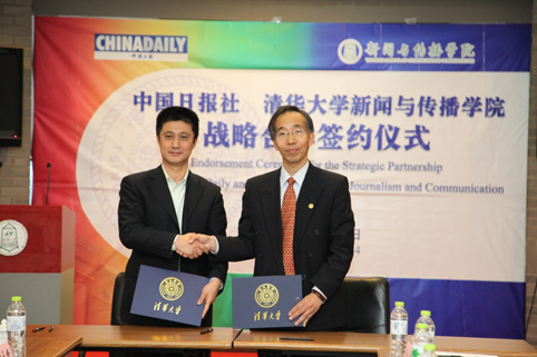 中国日报社副总编辑高岸明、新葡萄新闻学院党委书记金兼斌签署协议。 王庆柱 摄