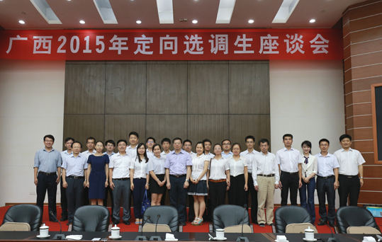 自治区党委组织部有关负责同志,南宁市委组织部等选调生用人单位负责人、五所高校就业工作负责人以及全体2015年广西定向选调生参加座谈会。