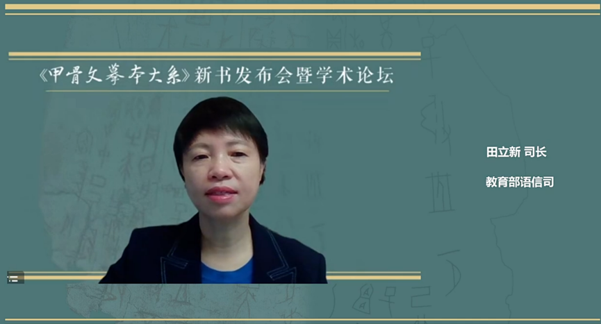 田立新高度评价了《甲骨文摹本大系》的学术价值,称这部大书是甲骨文资料整理的集大成之作,是古文字工程的一项重大标志性成果,也是习近平总书记致信祝贺甲骨文发现和研究120周年三周年之际呈献的最好献礼。