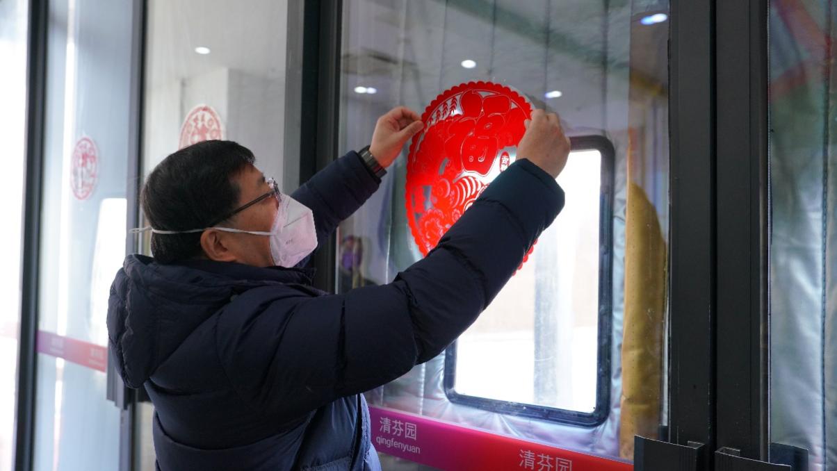 在清芬园食堂大门贴上“福”字窗花