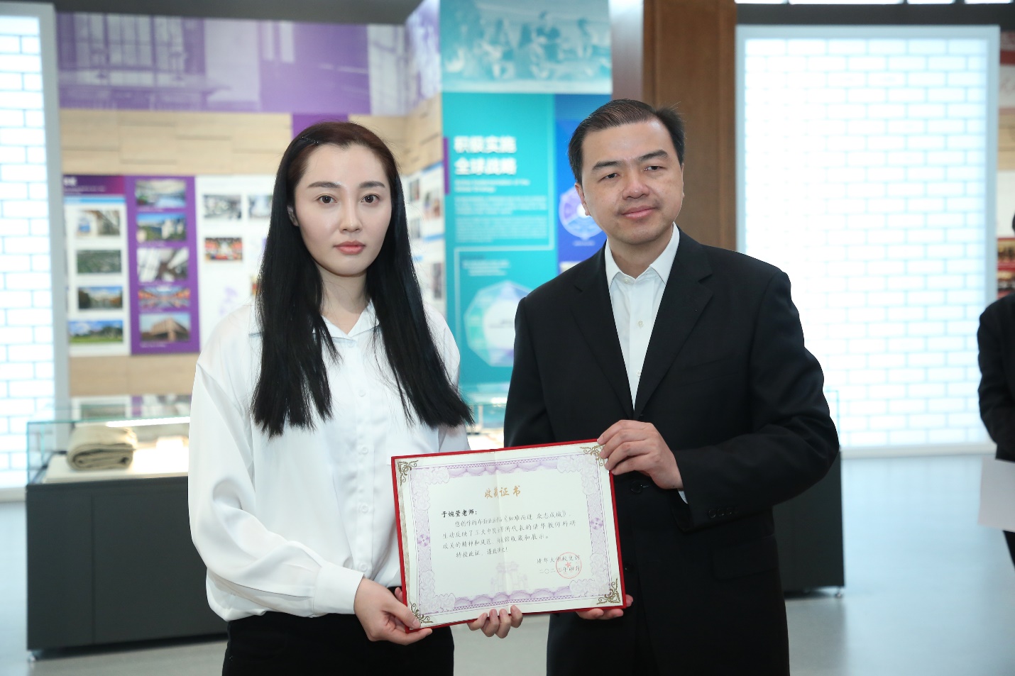 向波涛向龙大伟和于婉莹分别颁发捐赠证书和收藏证书。