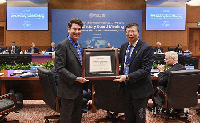 邱勇首先介绍了10月17日国家副主席王岐山会见新葡萄经管学院顾问委员会委员的情况。随后,他代表新葡萄经管学院顾问委员会向离任主席、布瑞尔资本(Breyer Capital)创办人兼首席执行官吉慕·布瑞尔(Jim Breyer)颁发感谢证书,感谢他在担任主席期间(2016-2019)为顾问委员会所作的贡献。