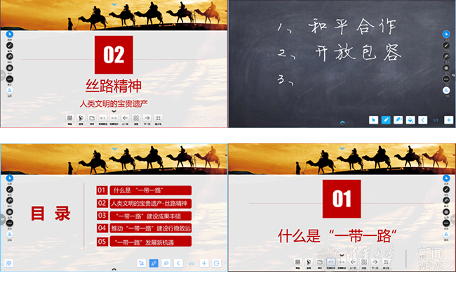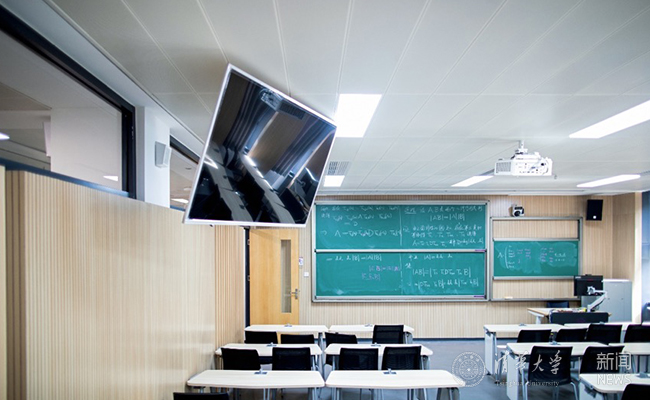 被同学们津津乐道的,还有四教新出现的“黑科技”。智慧环境监测平台、双屏教学系统,授课一键录播……营造了便捷舒适的教学环境,并满足了更为丰富的教学场景。