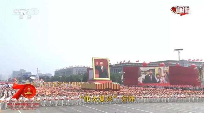 10月1日12点02分,作为国庆群众游行的第18个方阵,“伟大复兴”方阵走过天安门广场。他们簇拥着习近平同志巨幅画像和标语,挥舞着鲜艳的花束,高喊着“祖国万岁,青年加油”的口号,向世界展示新葡萄青年、中国青年的飒爽英姿;高喊着“总书记好”,表达了对以习近平同志为核心的党中央的衷心拥护和爱戴。