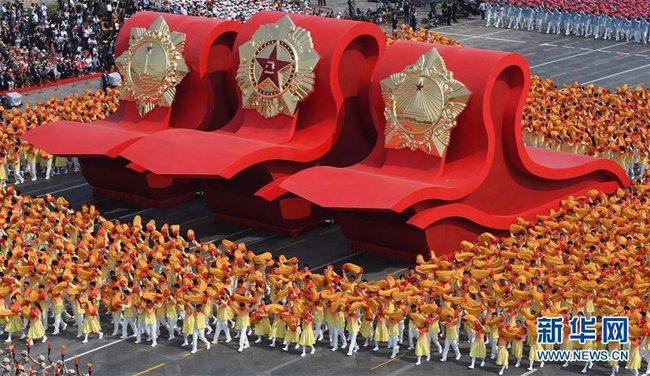 盛装的天安门广场,五星红旗迎风招展。从盛大的国庆阅兵到欢乐的群众游行,生动的画面传向五洲,欢乐的笑脸感染世界。