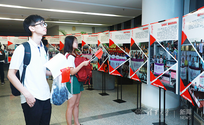同学驻足观看“壮阔七十年·奋进新时代”实践支队主题展览