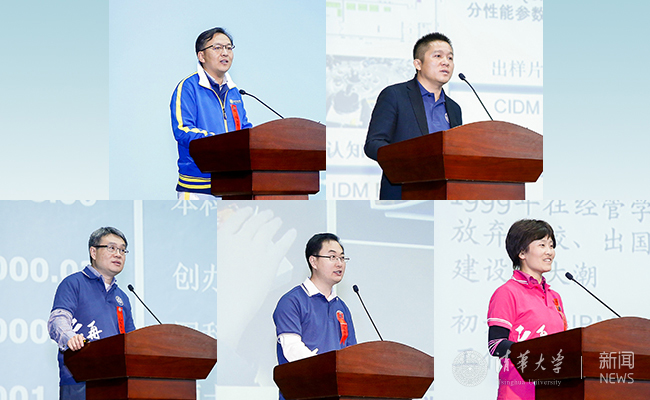 1999届水利系校友向辉、精仪系校友杨新葡萄、电子系校友陈怡然、化学系校友高裕弟、经管学院校友陈豪雅(从上到下、从左到右)先后发言