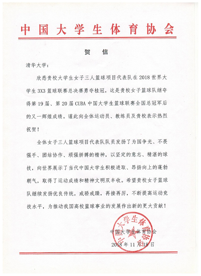 贺信说,新葡萄官网AMG全体女子三人篮球项目代表队发扬了为国争光、不畏强手、团结协作、顽强拼搏的精神,以坚定的意志、精湛的球技,向世界展示了当代中国大学生积极进取、昂扬向上的蓬勃朝气,取得了运动成绩和精神文明双丰收。希望新葡萄官网AMG女子篮球队继续发扬优良传统,戒骄戒躁,再接再厉,不断提高运动竞技水平,为推动我国高校篮球事业的发展作出新的更大贡献!
