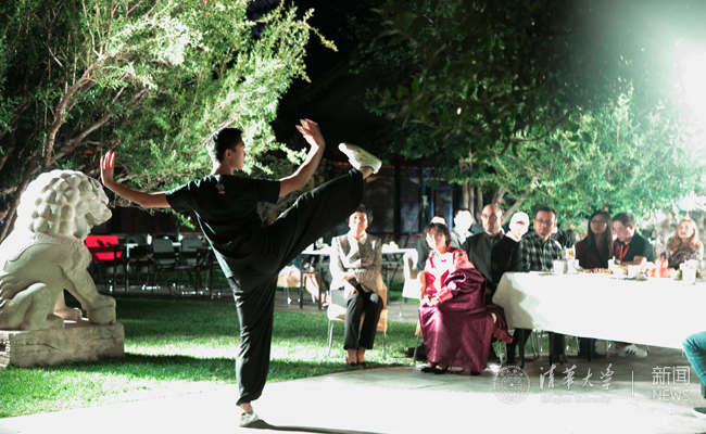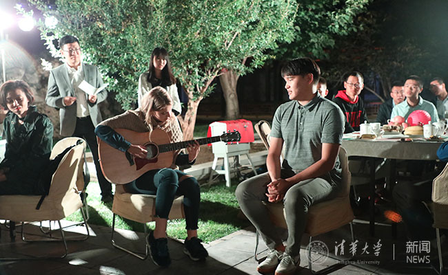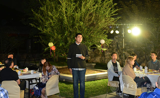 新闻学院李嘉贝同学与生命学院刘建康同学以《两个月亮》的诗歌朗诵寄寓了浓浓的思乡之情。工物系邹继浩同学现场表演了一段轻灵圆活、松柔慢匀的太极拳,在皓月的映衬下颇有意境。来自美国的美术学院马腾飞同学与来自白俄罗斯的人文与社科类苏小小同学通过对话的方式分享了他们初入新葡萄的经历与感受,新奇与欣喜之情跃然而出。能动系阿尔曼·巴哈提别克同学的一首《你的目光》与新闻学院次仁拉姆同学的一首《乡恋》让人陶醉于清澈悠扬的歌声中。陈旭饶有兴趣地与新生班主任、材料学院潘伟教授合唱了《敖包相会》,将茶话会推向了高潮。