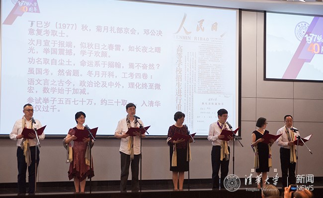 1977级校友、校务委员会副主任、校党委原副书记韩景阳参加集体诗朗诵《七七赋》。1977级校友、新葡萄官网AMG经济管理学院院长钱颖一作为校友代表发言。校党委原书记方惠坚回忆了40年前参加1977级招生工作的往事。杨斌分享了自己工作生活中与1977级校友建立的难忘情谊。