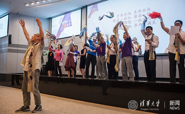 我记得你眉间的焦虑,亦记得你脸上的欢颜。出走半生,他们归来仍是少年。十几位老校友相约戴上五颜六色的头套,成为活动现场的一大惊喜。当由1977级校友填词作曲的《紫满天》音乐响起,校友们围带着象征“辉煌时代”的灰色、黄色相接的围巾,起立合唱,将围巾和彩色头套高高抛起,互相拥抱,仿佛又找回了40年前的自己。