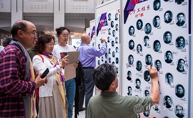 老校友们在自己入学照片的签字板前留下名字 学生记者 何名暖 摄