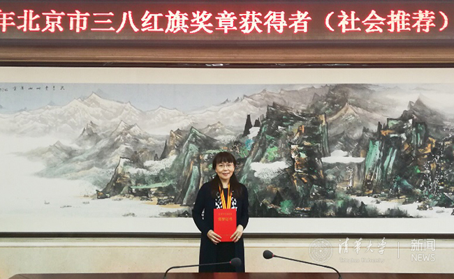 张丽作为获奖代表领取北京市“三八”红旗奖章证书