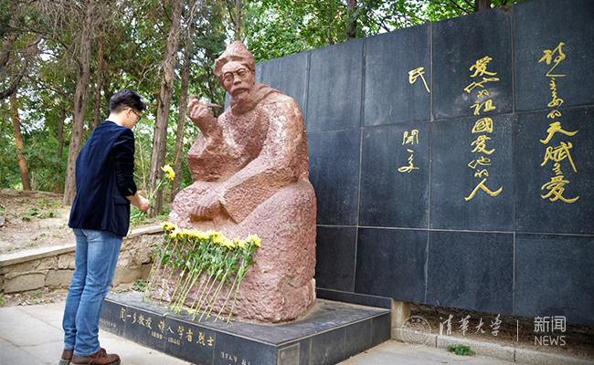 在闻一多烈士雕像前献花。