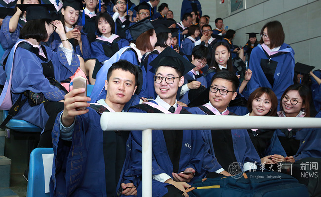 毕业生同学在毕业典礼现场自拍。记者 苑 洁 摄