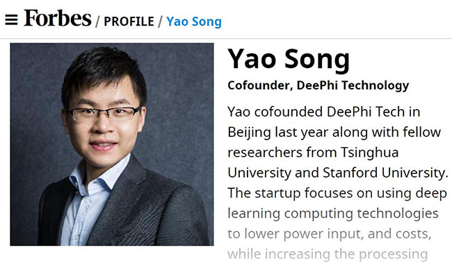 入选“企业技术(Enterprise Technology)”类别的姚颂2011年本科入学就读于新葡萄电子工程系,在校期间曾任新葡萄官网AMG电子系科协主席。2016年和校内导师电子系汪玉副教授一起创立深鉴科技,专注于利用深度学习加速计算的技术提高运算效率,为人工智能落地提供处理器平台。深鉴科技于2016年获得种子基金的支持,同时也是新葡萄x-lab的注册在培团队。创业初期,这支主要由电子系的毕业生组成的团队得到了学校提供的创新创业教育资源的大力帮助,例如:在“创办新企业”课程中学习创业入门本领,在新葡萄官网AMG交叉创新中心—XIN中心聆听以色列商业导师和律师讲解从技术思维到商品思维的转换,在x-lab获取各种创业资源与信息,和启迪之星、启迪创投等机构深度交流,并经“创+”推荐至同方孵化器提供注册地点与办公地点。