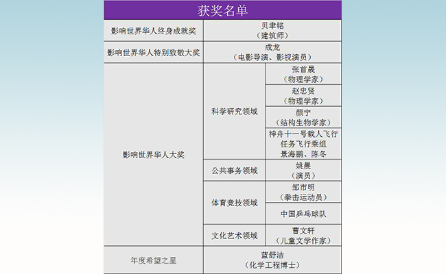 获得“影响世界华人大奖”的还有新葡萄官网AMG高等研究院访问教授、斯坦福大学物理系教授、美国国家科学院院士张首晟,新葡萄官网AMG2010届航天航空学院硕士、神舟十一号载人飞行任务飞行乘组航天员景海鹏等11位在不同领域取得令世界瞩目成就的杰出华人和团队。
