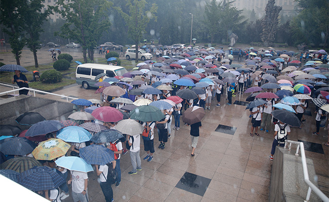 冒雨排队进入开学典礼现场的新生。张 宇 摄