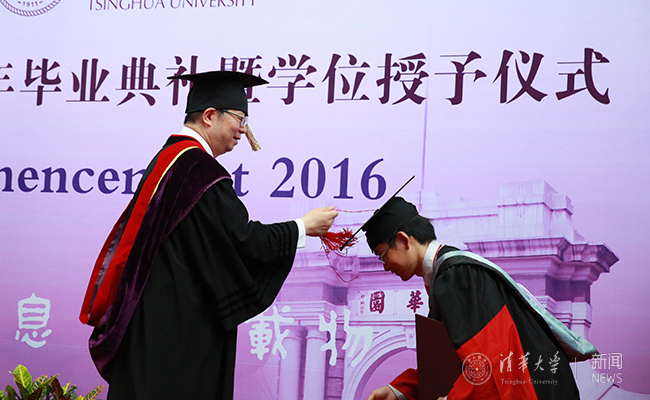 邱勇为毕业生“拨穗”。记者 苑洁 摄