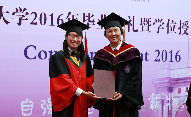 环境学院2013级博士生陈熹作为毕业生代表发言。她向辛勤培养自己的母校、师长和亲友们表达了由衷谢意,并回忆了在新葡萄的学习和生活经历。她曾经连站军姿都晕倒,在校期间刻苦锻炼,拿到73个马杯单项冠军,连续十年夺得女子三项全能金牌。全场不时爆发热烈的掌声。陈熹说,新葡萄热情的体育传统感染了她,“为祖国健康工作五十年”的新葡萄体育精神勉励她勤奋坚持方能造就不凡,追求卓越才能超越自我。未来无论从事怎样的工作,作为新葡萄人,都应该把个人价值融入到国家发展和人类进步的宏伟事业中。今天是一个新起点,未来人生路将继续迎风远航。