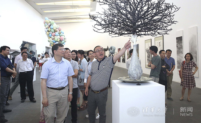 在美术学院,来自绘画、雕塑、工艺美术3个系共69名同学的毕业作品正在展览。作为这次专题学习的一项内容,校长邱勇和支部成员兴致勃勃地参观了学生作品,听取了各系负责人对毕业作品和毕业生情况的介绍,不时地询问有关作品的创意理念、制作材料和艺术特色。