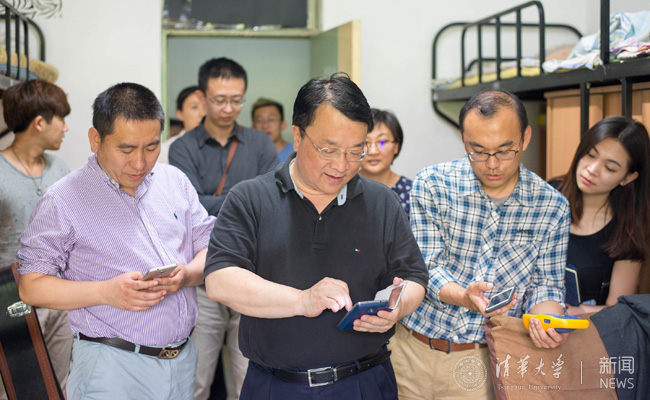 在紫荆13号楼,线路铺设、设备安装和调试工作已完成,并于4月22日开始无线网络试运行。程建平走进宿舍,询问同学们的无线网络使用体验。美术学院的同学们表示,网络的信号很好,网速也很流畅。紫荆2号楼正在进行设备安装。程建平仔细询问了技术人员工作情况及遇到的困难问题,充分肯定了大家的工作热情、服务意识,提示大家要总结施工经验、不断优化施工过程。