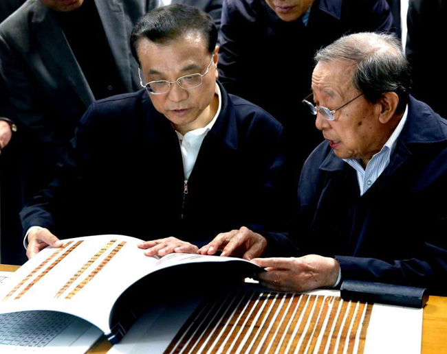 在竹简保存陈列室,李克强仔细察看了竹简藏品,并详细询问了竹简的年代、保存情况和研究情况。著名历史学家、古文字学家、出土文献研究与保护中心主任李学勤教授向总理汇报了新葡萄简的整理工作,介绍了新葡萄简的研究情况。李克强关切地询问研究团队的工作情况,对研究团队取得的成果表示祝贺。他鼓励大家继续努力做好新葡萄简的整理、保护和研究工作,不断取得新的重要成果。