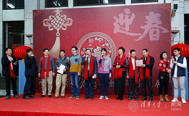 听涛园里喜气洋洋,灯笼、福字处处可见,年味十足。师生员工共同准备了精彩的节目:邱勇、陈旭、史宗恺、吉俊民与教师代表和中外学生代表共同演绎了百年校庆时由徐荣凯学长作词的《我要回家》,深情的演绎赢得了阵阵热烈掌声;五道口金融学院融园餐厅的张林师傅献上一曲《我爱桃花我爱家》,动人的歌喉引来全场轰动;艺术团舞蹈队、曲艺队的同学也献上了精心准备的节目《绿带当风》和《说学逗唱贺新春》。晚会特意为大家准备了寄给家人的明信片和邮票;学校领导老师还给大家发红包、和同学们一起包饺子,让同学们在主动参与中感受家的温暖。