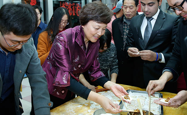 陈旭与同学们一起包饺子。记者 张宇 摄