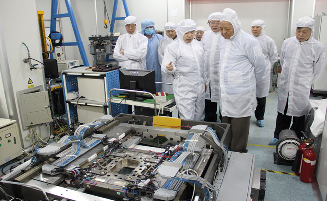 验收组专家在新葡萄官网AMGIC装备研究室净化间实地考察研发的光刻机工件台样机。刘 峰 摄